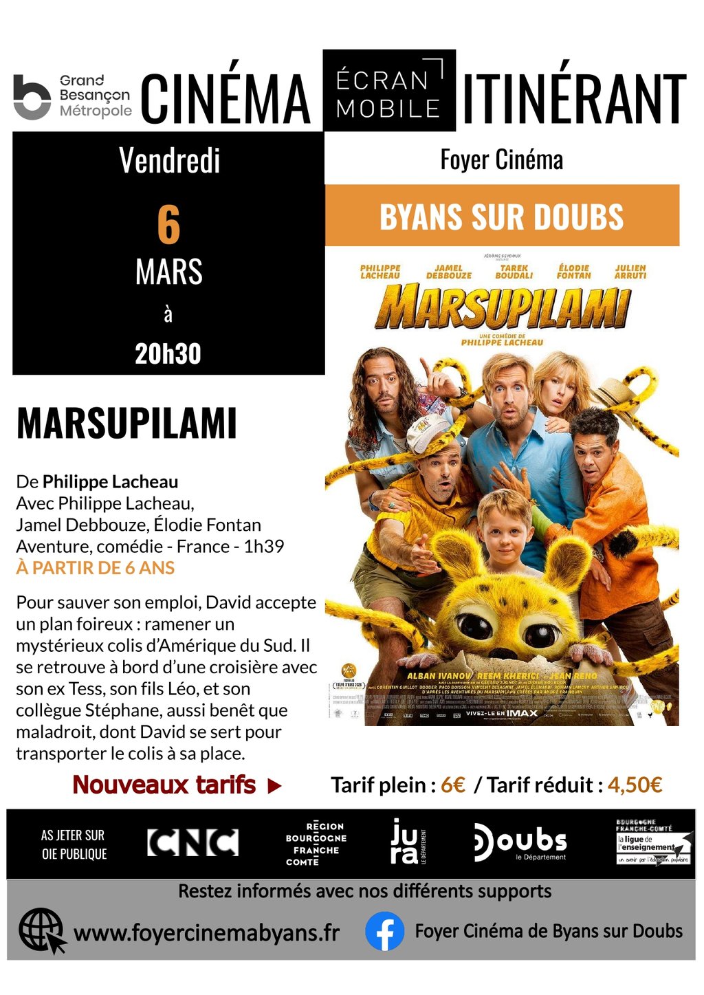 Projection du film "Marsupilami" le vendredi 6 mars 2026 à 20h30 au foyer cinéma.